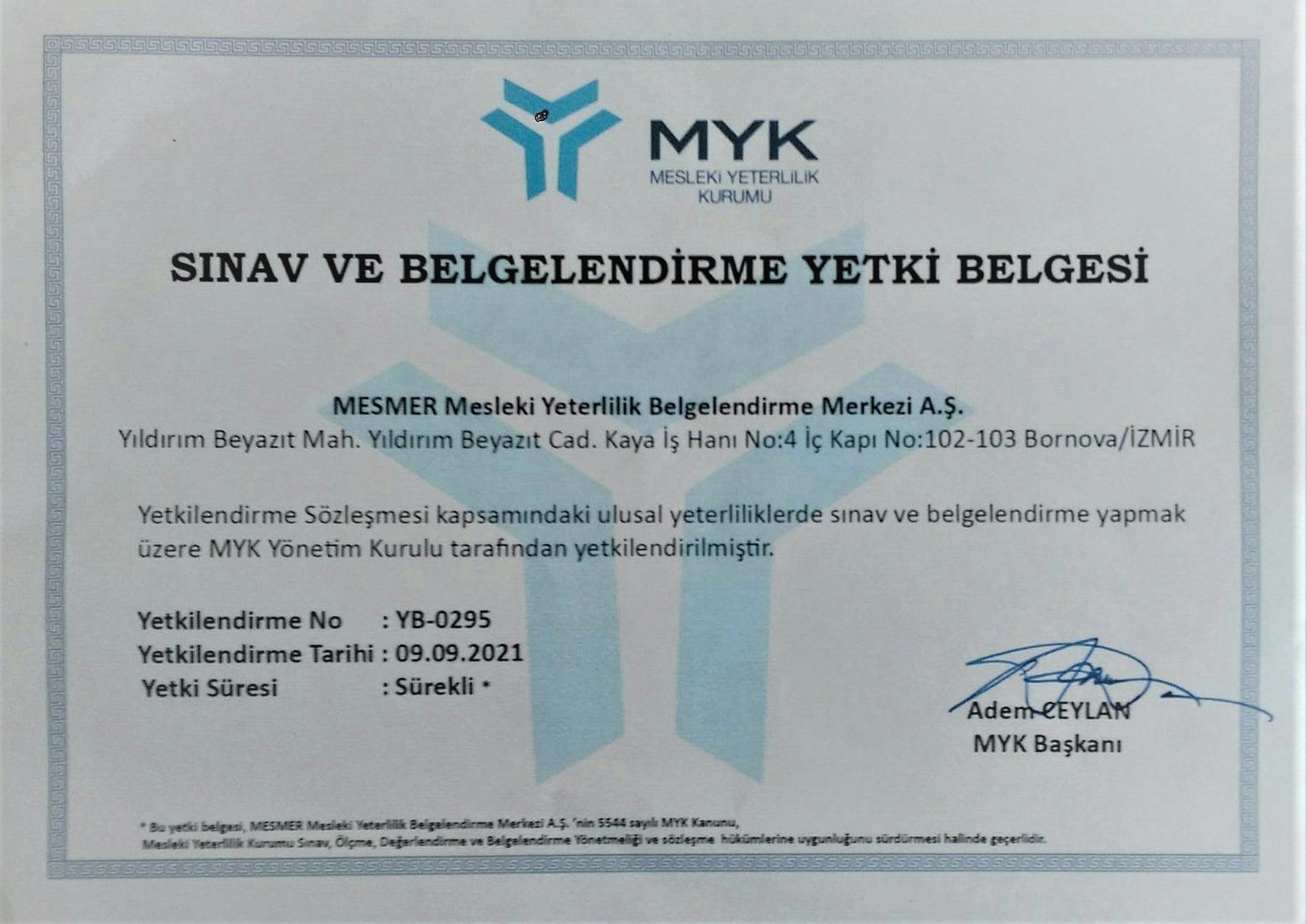 MESMER Mesleki Yeterlilik Belgelendirme Merkezi A.Ş. Mesleki Yeterlilik Kurumu (MYK) tarafından yetki kapsamındaki ulusal yeterliliklere göre sınav ve belgelendirme faaliyetlerini yürüten Yetkilendirilmiş Belgelendirme Kuruluşudur.